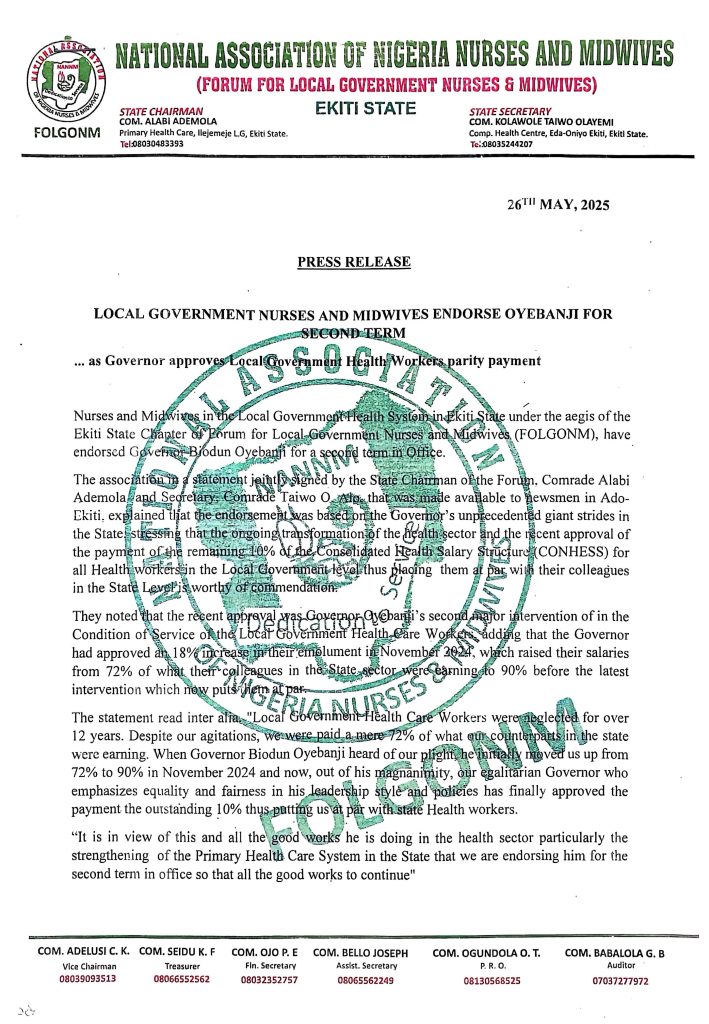 Nurses and Midwives in the Local Government Health System in Ekiti State under the aegis of the Ekiti State Chapter of Forum for Local Government Nurses and Midwives (FOLGONM), have endorsed Governor Biodun Oyebanji for a second term in Office.