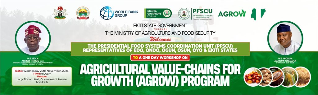A statement from the Ekiti State Commissioner for Agriculture and Food Security, Mr. Ebenezer Boluwade, made available to newsmen in Ado-Ekiti said the workshop slated for the Lady Jibowu Hall, Government House, Ado-Ekiti is being convened under the auspices of the Presidential Food Systems Coordinating Unit (PFSCU) as part of the implementation framework for the Sustainable Agricultural Value-Chains for Growth (AGROW) programme.