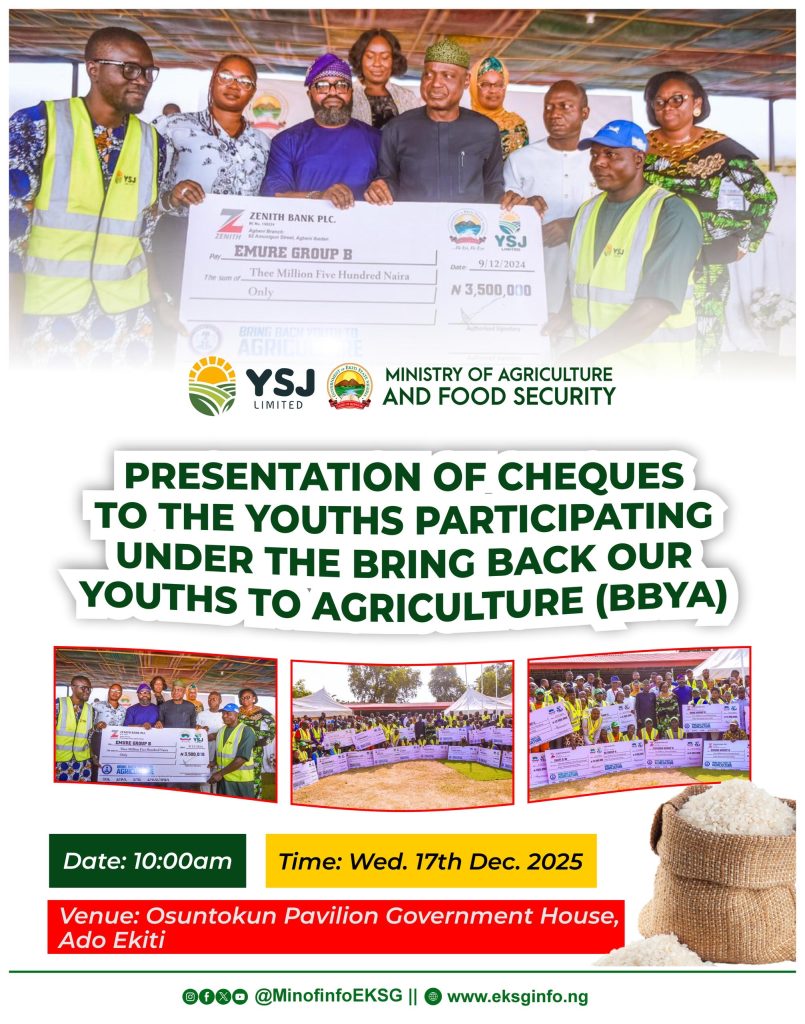 Ekiti State Government will on Wednesday, December 17, 2025, disburse ₦1 Billion to 4,657 beneficiaries under its Bring Back Our Youths in Agriculture programme.