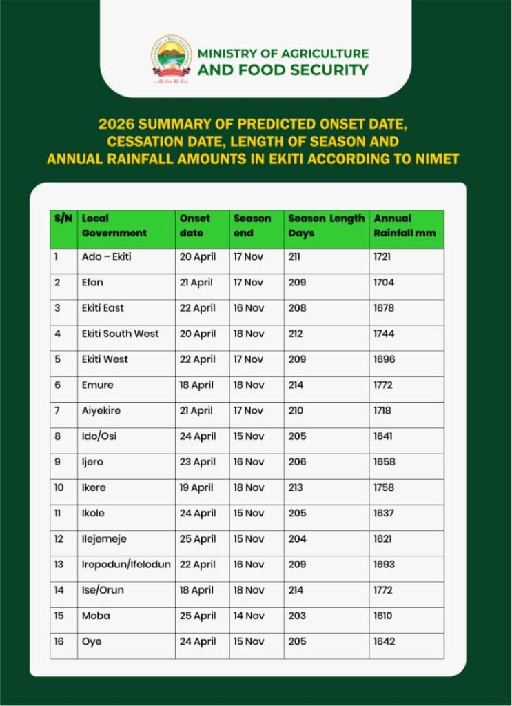 A statement from the Ekiti State Ministry of Agriculture and Food Security, made available to newsmen in Ado-Ekiti said the Nimet forecast outlines the expected onset and cessation dates of rainfall, as well as projected annual rainfall totals across the state’s 16 local government areas.